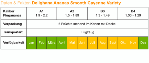Die Sorte Smooth Cayenne ist die ursprünglichste afrikanische Ananas und wird zu Recht als «die Königin» gehandelt. Sie ist an ihrer leicht konischen Form und ihrem tropischen Duft gut zu erkennen. Ihr Geschmack vereint in ausgewogener Balance fruchtige Süsse und erfrischende Säure, weshalb sie von Kennern besonders geschätzt wird. Aufgrund ihrer Exklusivität exportieren wir diese Sorte per Flugzeug.